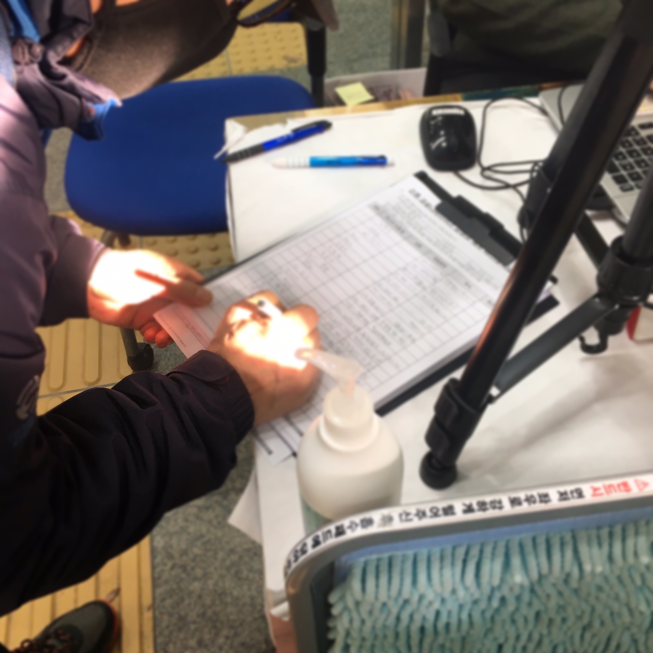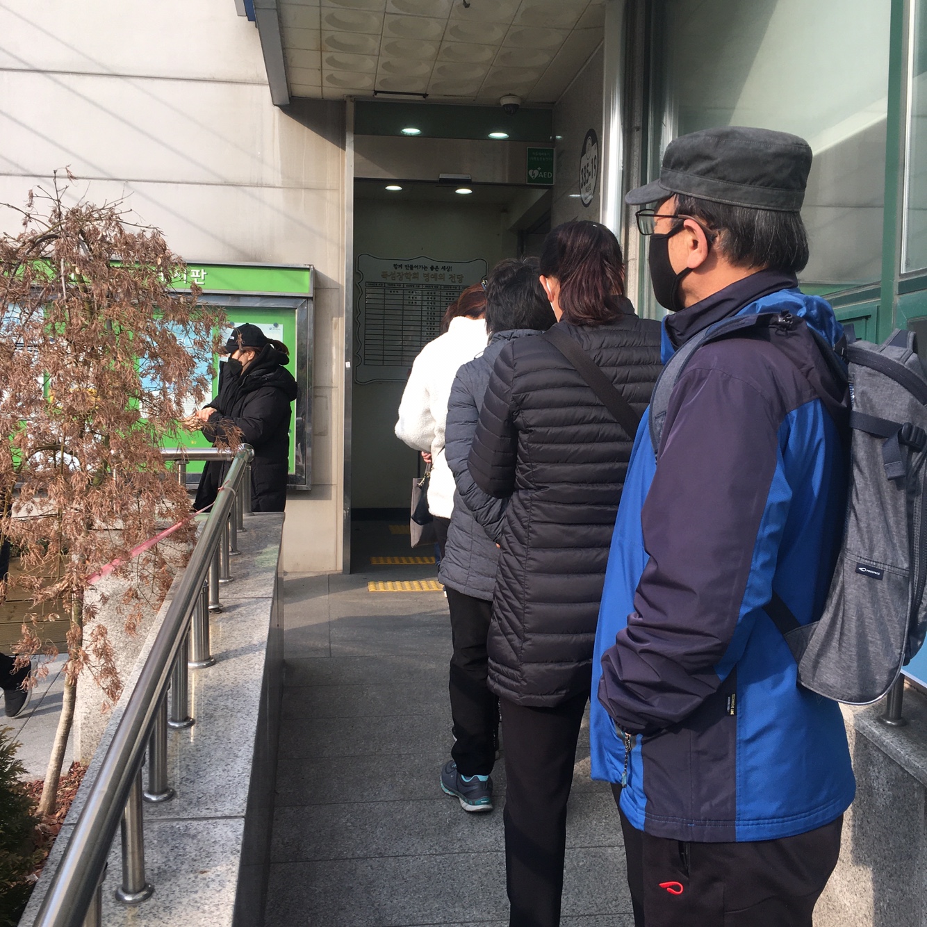 줄끝에는 남자분 두 분이 계시더라고요 한분은 수기 작성을 끝나면 마스크를 주시고 한분은 컴퓨터 정보 입력을 하셨어요