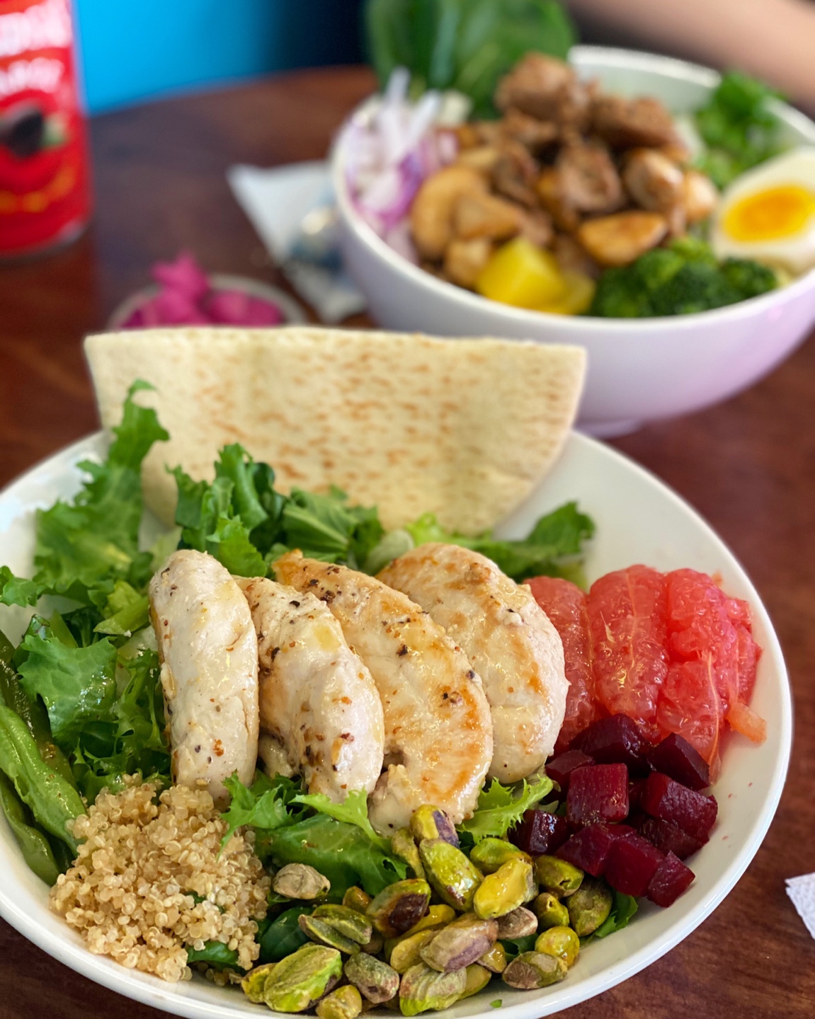 저는 그릴드 치킨 샐러드 주문하고 동동이는 머쉬룸 포크 보울을 주문했어요!